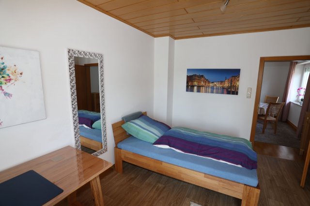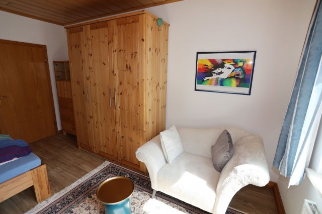 Das Zimmer ist voll möbliert (Bett, Schrank, Schreitisch, Stuhl und Sessel).