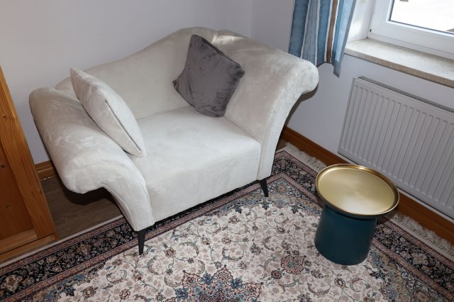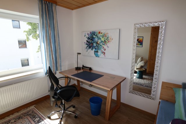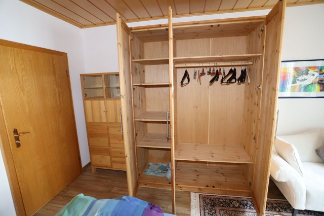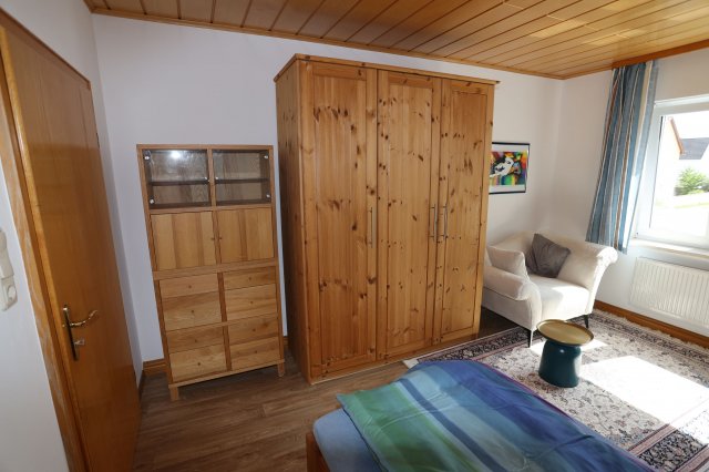 Das Zimmer ist voll möbliert (Bett, Schrank, Schreitisch, Stuhl und Sessel).
